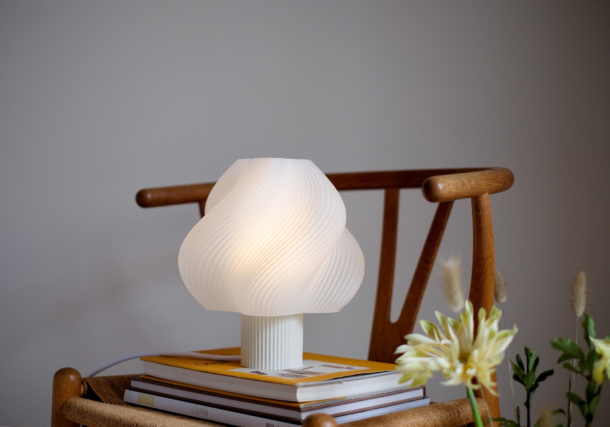 Soft Serve Lamp Regular - 3D printed table lamp from Swedish Creme Atelier, founded by the designers, Jacqueline Kessidis and Lucas Lind. When the couple renovated their home, the idea was born to create a lamp as environmentally friendly as possible: The lamp is 3D printed in Stockholm with minimal material waste from recycled food packaging and PLA – biological plastic, extracted from corn starch. The table lamp won the Scandinavian Design Awards 2023 "Detail of the Year" and the Plaza Interiors Sustainability Awards 2022.