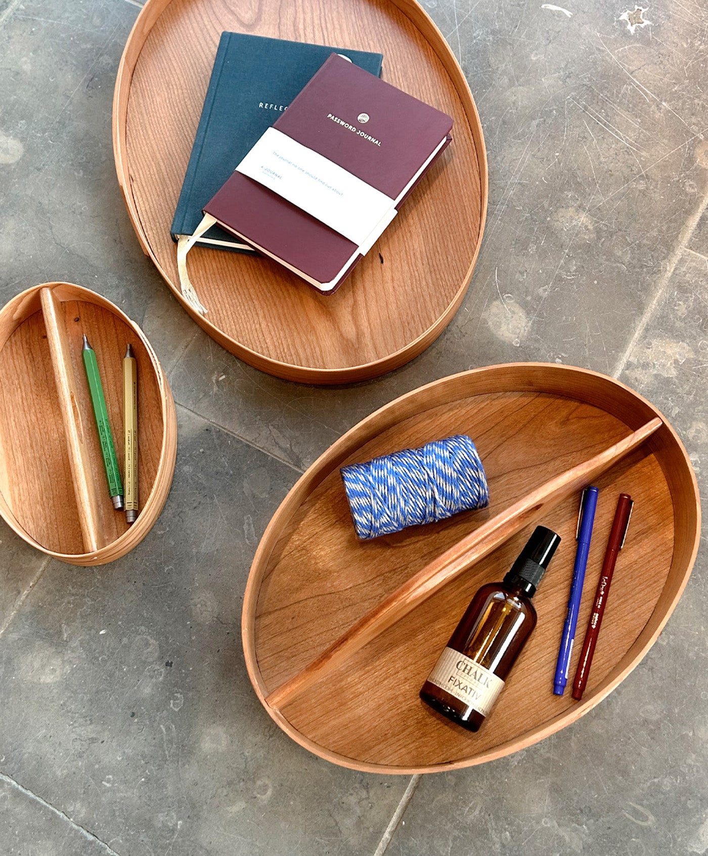 Trays inspired by the shakers' philosophy of life and values of purity, orderliness and sustainability
