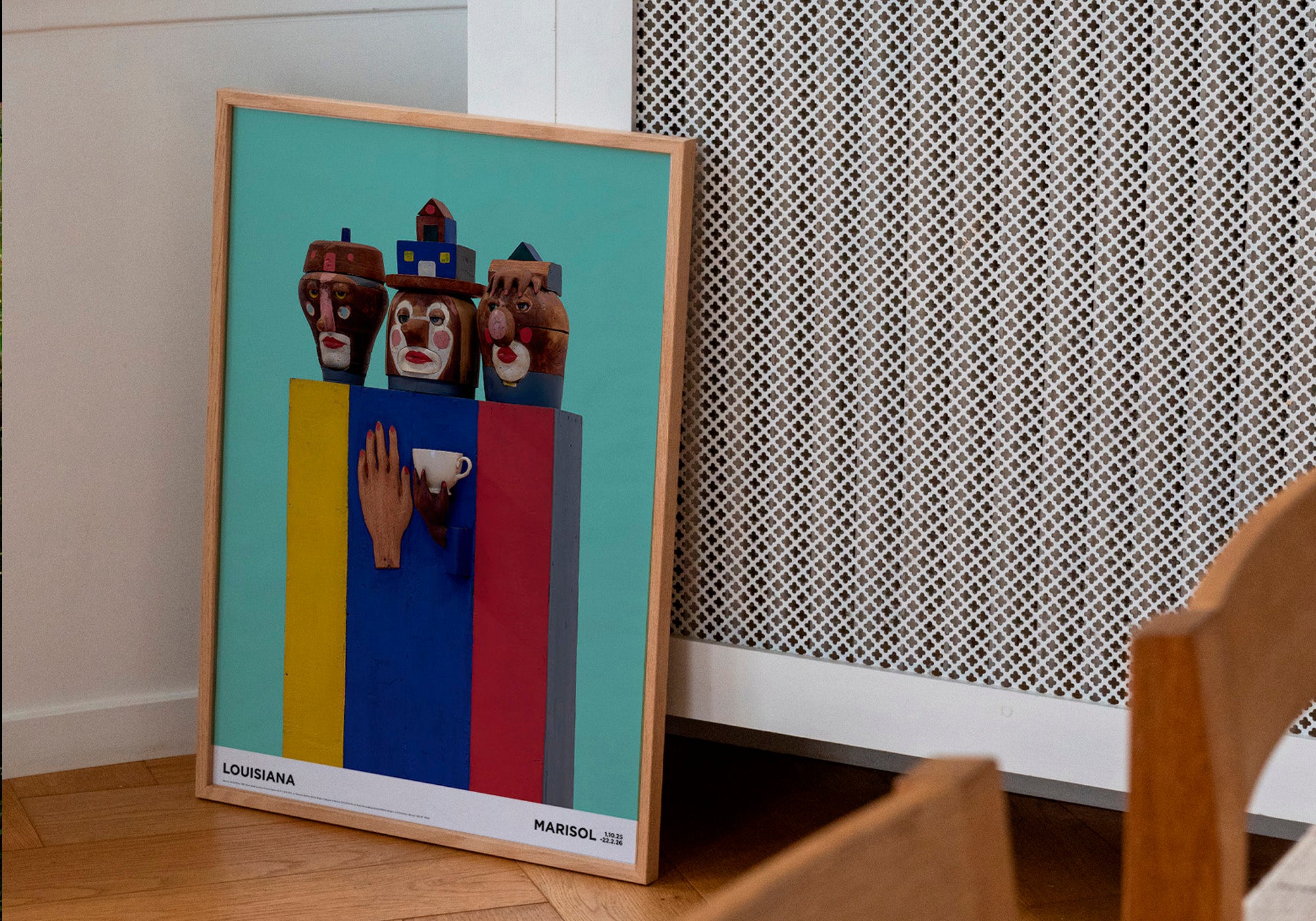 Louisiana Poster with the work Tea for Three, 1960. Detail, by the Venezuelan-American Marisol (1930-2016), published on the occasion of Louisiana's exhibition in 2025. In 1960, Marisol began making plaster casts of her face, head, and other body parts. She incorporated these casts into her new, larger figurative sculptures, including Tea for Three.