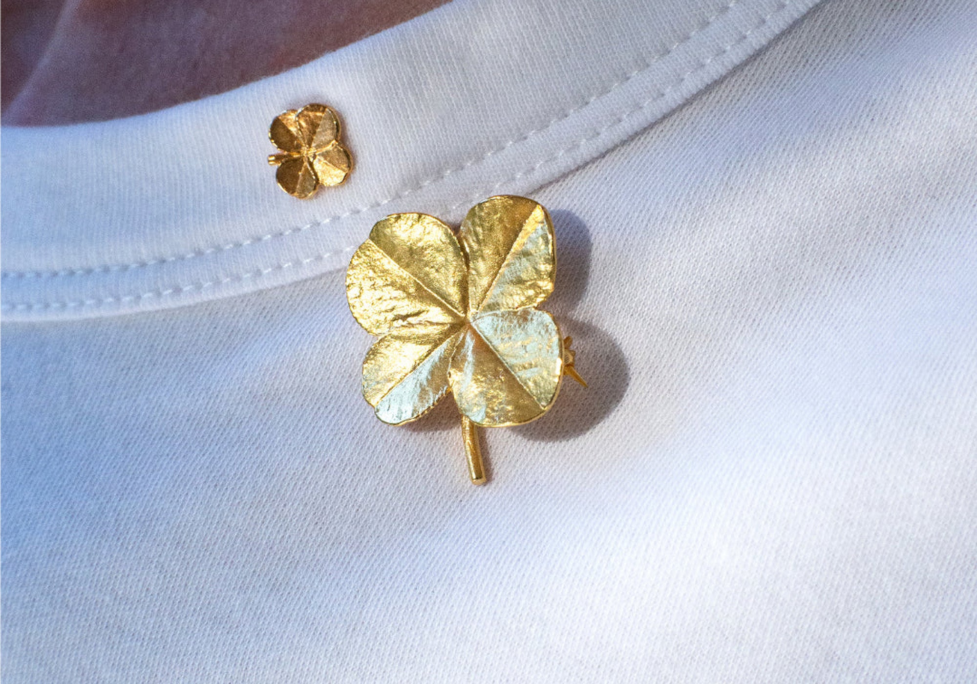 Firkløver Broche er håndlavet i sterlingsølv med en 22 karat forgyldning.