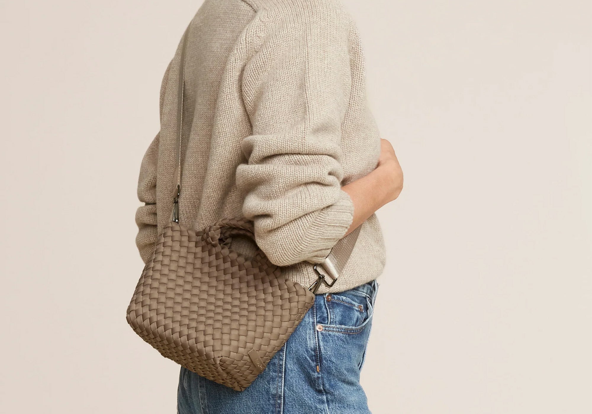 St. Barths Petit Tote er en håndvævet flettet taske i neopren fra designbrandet Naghedi. Tasken er lavet af materialer, der er holdbare og lette at pleje. En matchene vævet lynlåspung medfølger. Kun online.