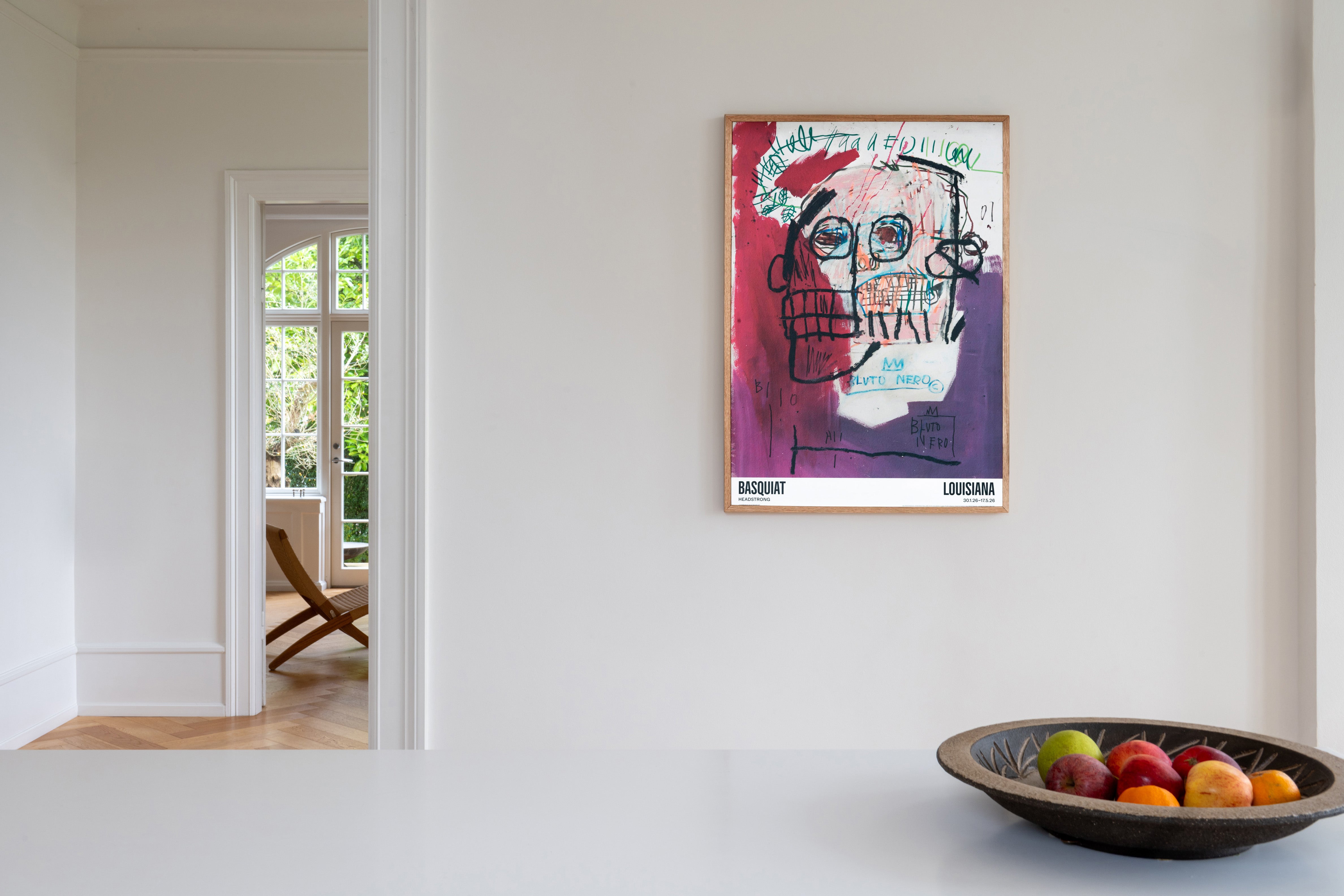 Louisiana Opklæb med værket Untitled (Bluto Nero), 1982 af den amerikanske kunstner Jean-Michel Basquiat (1960-1988), udgivet i forbindelse med udstillingen 'Basquiat - Headstrong'. Plakaten leveres færdigindrammet med en mat lamineret overflade, der reducerer refleksioner fra lyskilder markant sammenlignet med almindeligt glas og giver et flot, roligt visuelt udtryk uden genskin. Rammen er udført i egetræsfiner.