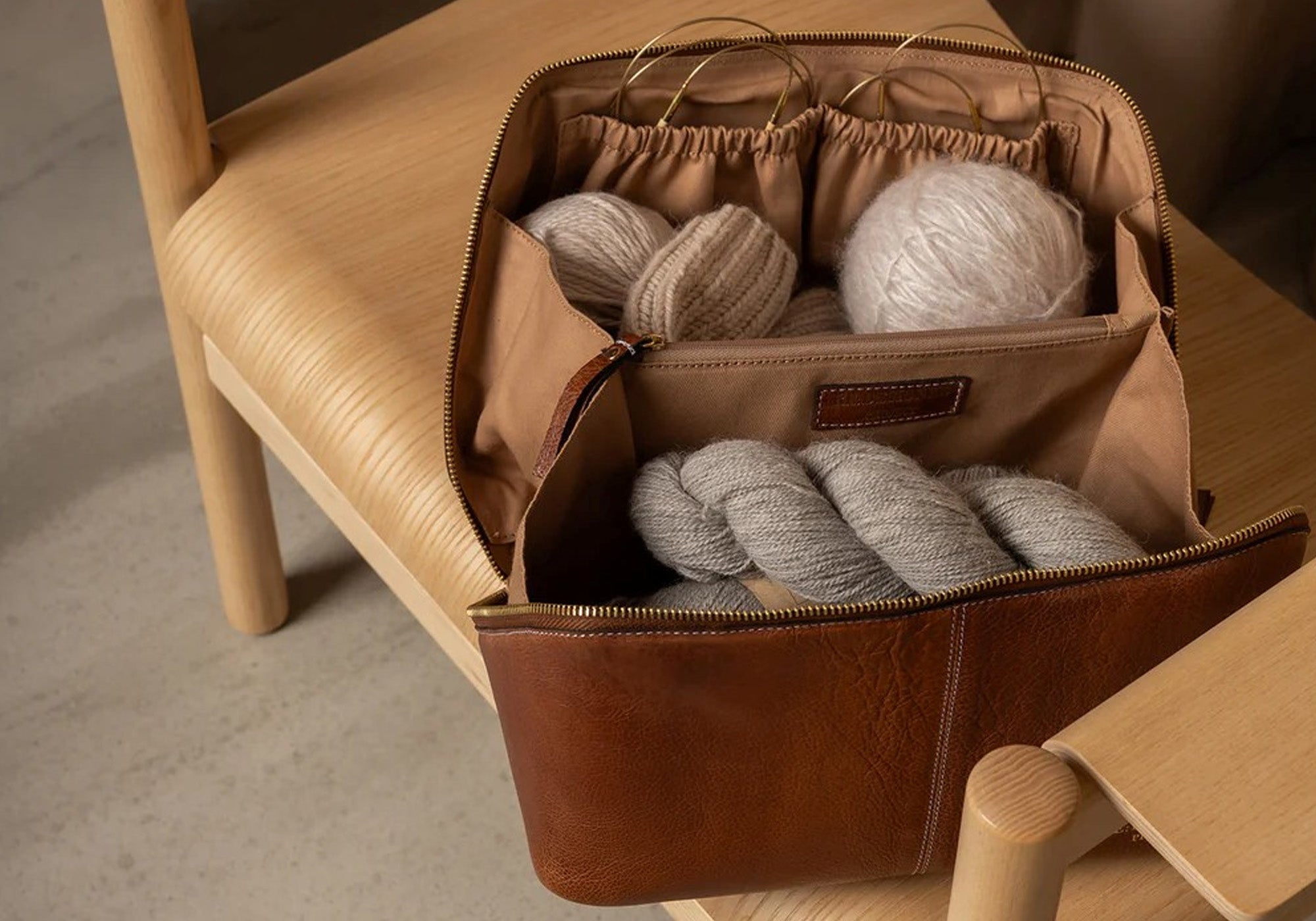 Håndlavet strikketaske Project 10 – designet til strikkeelskere og garnentusiaster, fra det danske designbrand Re:Designed. Tasken har en sektion til strikkeværktøj som saks, maskemarkører og pinde. Den er lavet i Urban læderkvalitet – et bearbejdet ko-læder, der farves, før overfladen afsluttes, så læderets naturlige kornmønster bevares. En let voks giver en glat og behagelig finish.